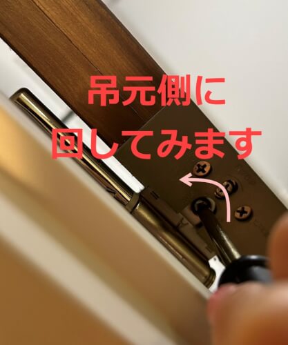 そして、「戸先側/吊元側」(扉の左右の方向に調整)のネジを「吊元側」(蝶番の方向)に少しずつ回していきます。